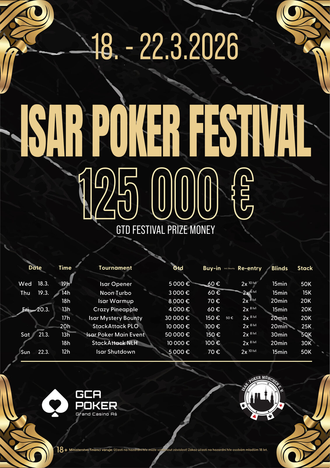 V západočeském Grand Casinu Aš probíhá od středy do neděle Isar Poker Festival, který zahrnuje celkem devět jednodenních turnajů s celkovou garancí €125.000. Ve středu a ve čtvrtek byly na programu eventy Isar Opener a Isar Warm Up.