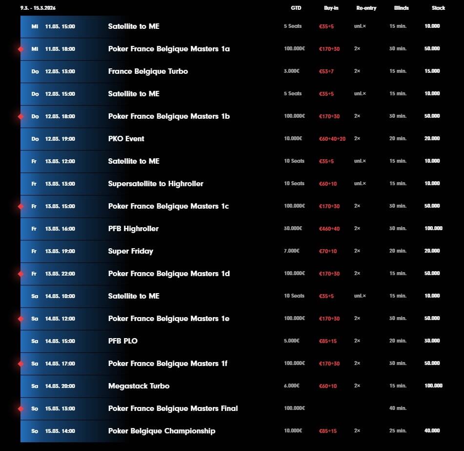 Už ve středu odstartuje hlavní turnaj Poker France Belgique Masters €100K GTD prvním startovním flightem 1A. Do Main Eventu je buy-in nastaven na €170 +€30 a dohromady se bude konat šest startovních dní, kdy z každého flightu postoupí vždy 12,5% celkových entries. A finálový den bude na programu v neděli.