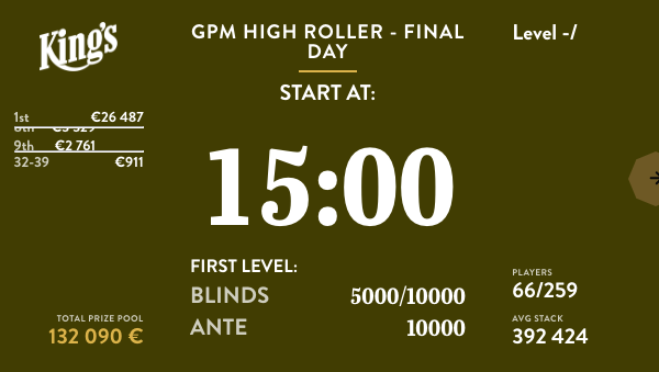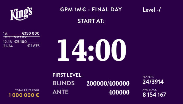 Nakonec necelých 4.000 entries si připsal Main Event listopadových German Poker Masters v rozvadovském King's Resortu. Milionový prizepool v eurech byl pokořen. Po nedělních bojích zůstává na svých místech už jenom 24 nejlepších, kteří dnes zabojují o titul šampiona.