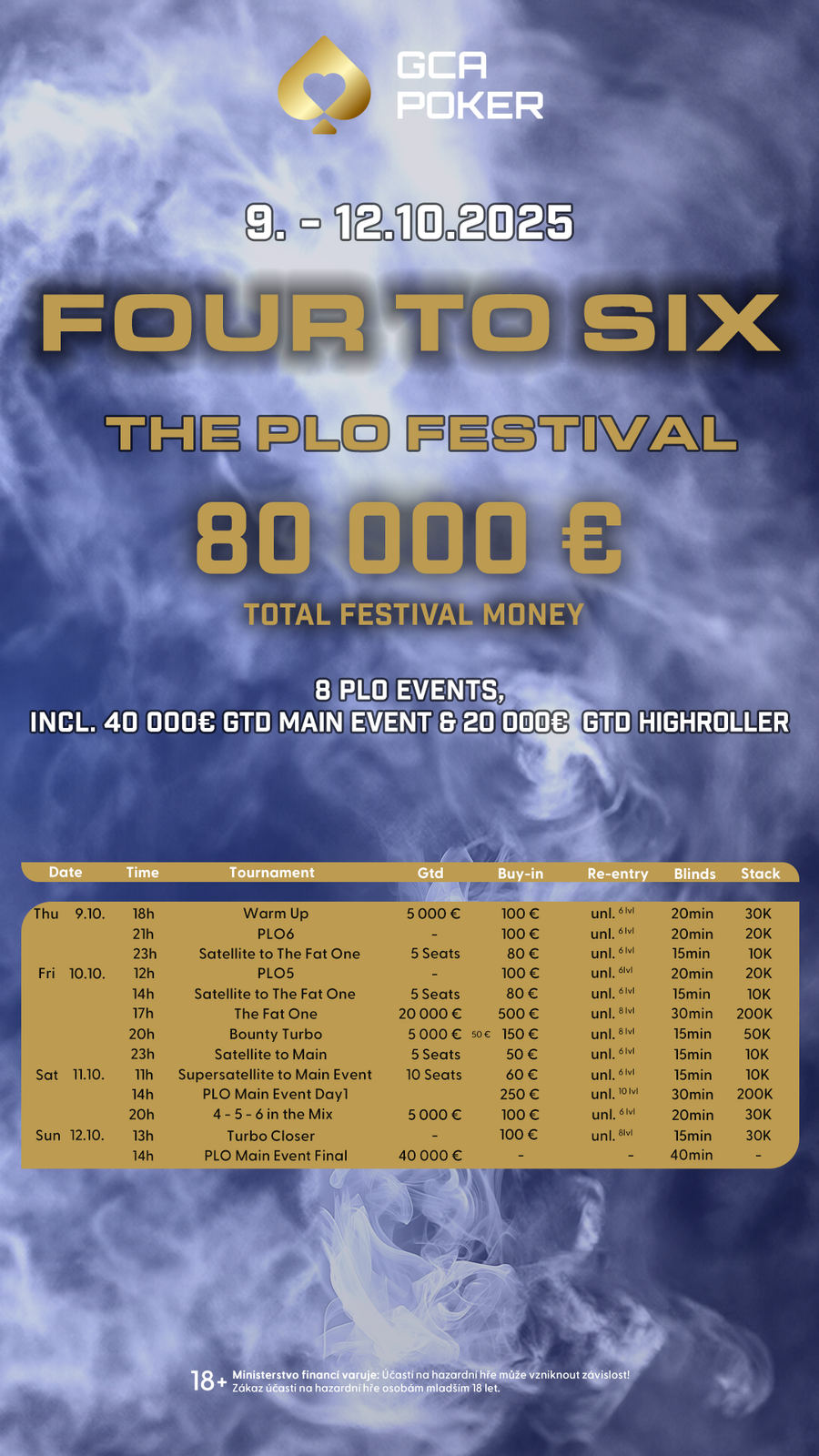 Čtvrtek bude v ašském Grand Casinu začátkem pokerového festivalu pro vyznavače čtyř a více karet v ruce. Four to Six festival obsahuje celkem 8 různých PLO turnajů s celkovým prizepoolem €80.000!