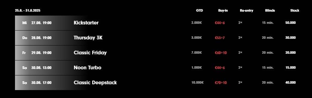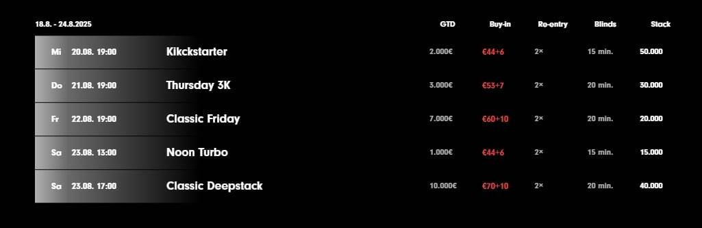 Tradiční páteční turnaj, už nějakou dobu pod novým názvem, Classic Friday, má stejné parametry jako dřívější Friday 7K, takže buy-in je nastaven na €60 +€10 a garance činí €7.000. Začátek je v 19:00, starting stack činí 20.000 v žetonech a blindy se mění po 20 minutách. Friday Classic je na programu tento týden 22. srpna a znovu za týden 29. srpna.