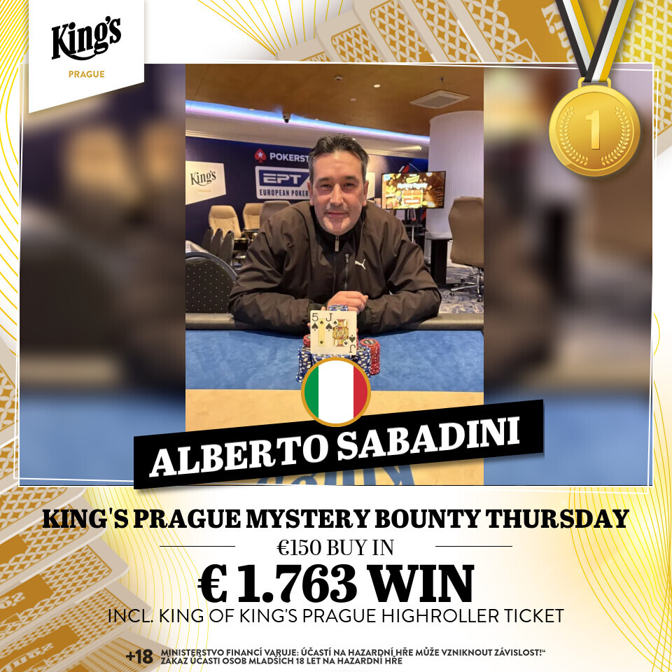 Čtvrtek v pražském King's v hotelu Hilton patřil tradičně turnaji Thursday Mystery Bounty, který má nastavený buy-in na €100 + €50(bounty) a hraje se o podíly z garantovaného prizepoolu €10.000.