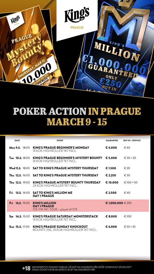 Na páteční večer je v Hiltonu připraven pražský flight rozvadovského Main Eventu King's Million, který za vstupné pouhých €250 garantuje minimální prizepool ve výši €1.000.000! Páteční pražský flight startuje v 19:00 a od 16:00 je možnost zapojit se do satelitu o deset vstupů za €40.