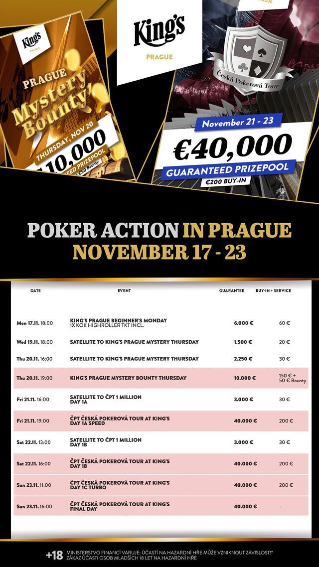 Turnajový program tohoto týdne v King's Prague v hotelu Hilton obsahuje dva klasické jednodenní eventy a především další vydání České Pokerové Tour, vícedenní ČéPéTéčko přináší garanci €40.000.