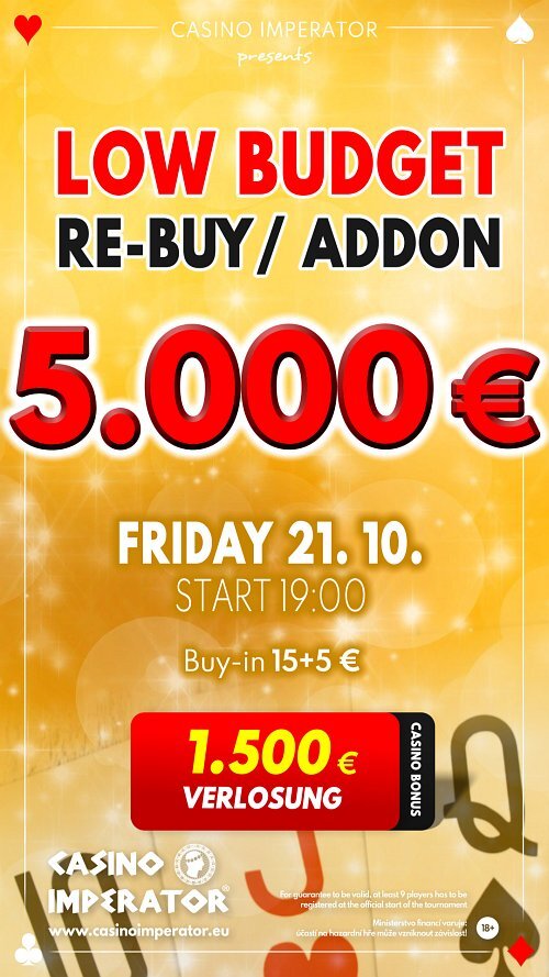 Máte rádi poker, ale nejste ochotni investovat vyšší částky? Pak možná právě pro vás si v jihočeském casinu Imperator připravili páteční Low Budget event, který při startovném €15+5 nabídne i tak zajímavou garanci €5.000.