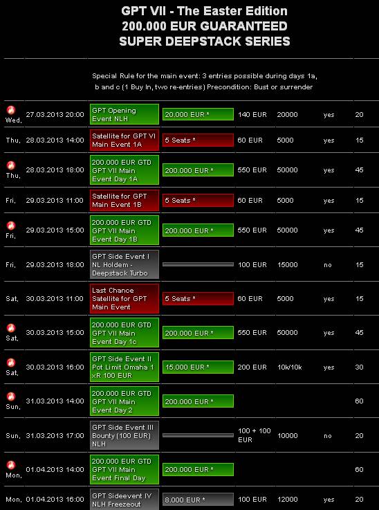 Březnové turnajové řadění v rozvadovském King’s ukončí tradiční German Poker Tour, tentokrát s podtitulem Velikonoční edice. Main Event Deepstacku GPT vypukne ve čtvrtek 28. března od 18:00 zahajovacím dnem 1A. Při buy-inu €550 je garantováno minimálně €200.000. Počáteční stack činí luxusních 50.000 v žetonech, blindy po 45 minutách. Součástí GPT bude i trojice kvalifikací, kde se za €60 můžete snadno kvalifikovat a ušetřit tak nemalé množství na vstupném do ME.