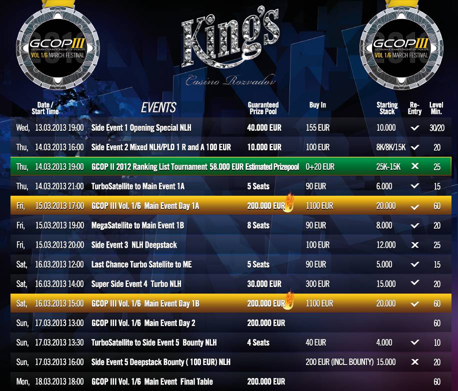 Sotva vyvrcholila druhá sezóna German Championship of Poker svým Grand Finálem, 15. března je na programu zahájení třetí sezóny. Od 17:00 je připraven Main Event den 1A s buy-inem €1.100 a celkovou garancí €200.000. Druhý flight pak startuje v sobotu 16. 3. od 15:00. Ještě před samotným ME GCOP je pro věrné hráče přichystán GCOP II 2012 RankingList freeroll s předpokládaným prize-poolem €58.000. Zdali figurujete mezi TOP 200 hráči v žebříčku, to zjistíte na stránkách King’s Casina. Start ve čtvrtek 14. 3. od 19:00.