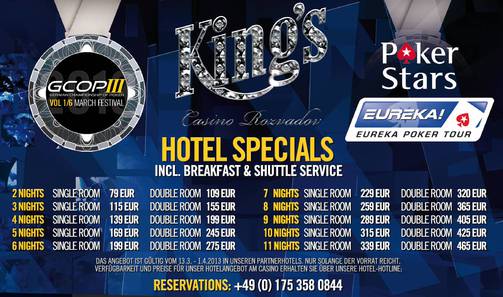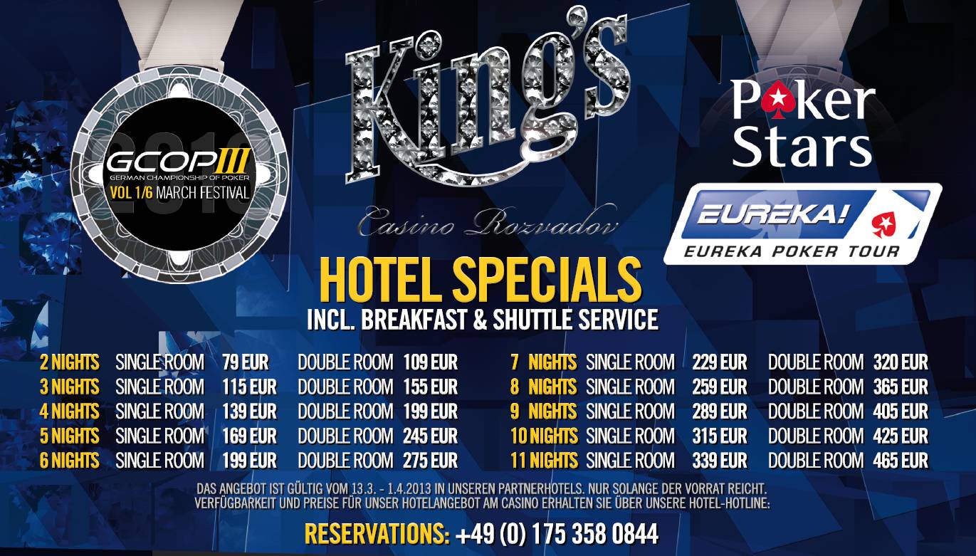 V nabídce je zahrnuta snídaně a 24hodinový shuttle servis z hotelu do casina a zpět. Rezervace pokojů na tel. 0049 175 358 08 44 nebo hotel@kingscasino.eu.