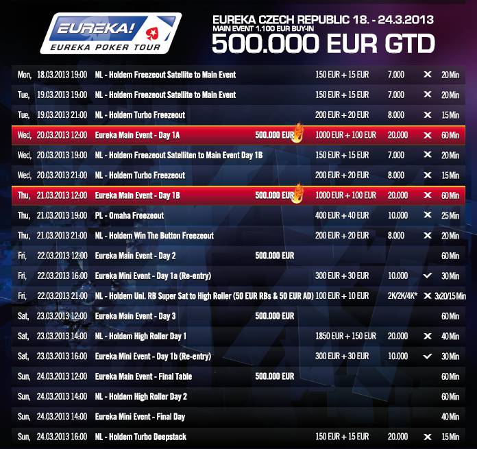 Pomyslné žezlo nejočekávanějšího turnaje pro měsíc březen přebírá PokerStars Eureka Poker Tour. Ta vypukne 20. března od 12:00 úvodním dnem 1A. V Main Eventu je při vstupném €1.100 garantováno neuvěřitelných €500.000. Hráči po zaplacení buy-inu obdrží 20.000 žetonů a blindy budou stoupat po 60 minutách. V hlavním turnaji je výjimečně zakázáno využít re-entry.