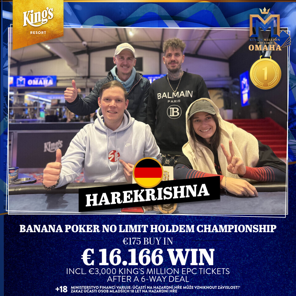 V neděli se v rozvadovském King's Resortu hrál den 2 hlavního turnaje King's Million PLO, který při buy-inu €1.100 garantoval prizepool €1.000.000. Na programu byl také finálový den Banana Poker NLH Championshipu s buy-inem €175 a garancí €200.000.
