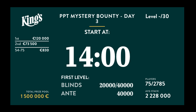 Kompletní program a detaily jednotlivých eventů (st. stack, blindy, struktura...) v rozvadovském King's naleznete na turnajových stránkách https://kings-resort.com/poker
