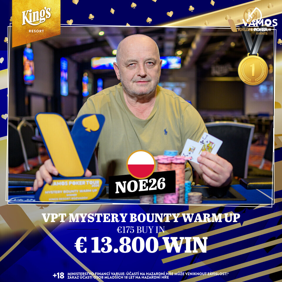 Středeční turnajové boje festivalu Vamos Poker Tour v rozvadovském King's Resortu probíhaly na několika frontách, finále VPT Mystery Bounty Warm Upu €100K GTD, první startovní flight 1A VPT Main Eventu €600K GTD a také den 1 VPT High Rolleru €100K GTD.