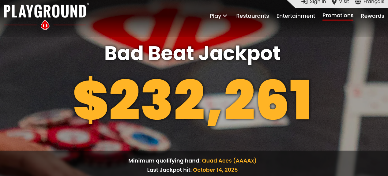 Ač se vyplatila nádherná suma, šlo až o pátý nejvyšší Bad Beat jackpot v historii Playground Casina. Rekordních CAD $2,6 milionu získali hráči v srpnu 2023, také na blindech $1/2.