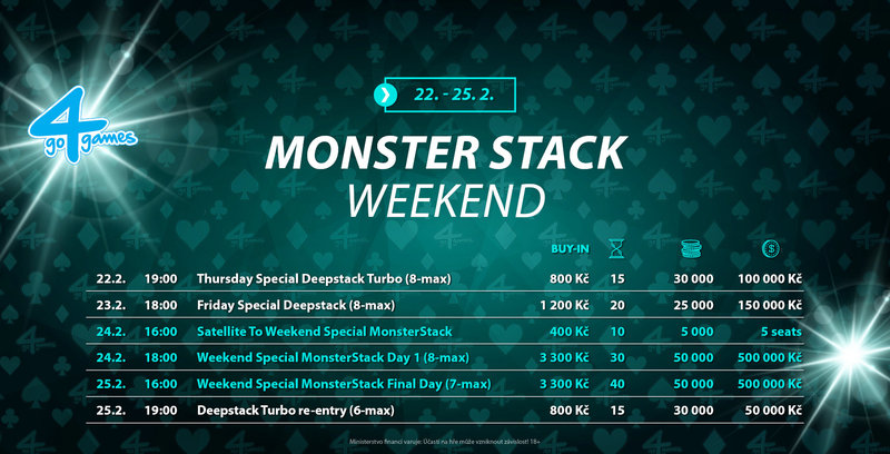Závěr února bude v Hodolanech od čtvrtka 22. 2. do neděle 25. 2. patřit záplavě žetonů do počátečních stacků i navýšeným garancím v řadě speciálů. Zvýšené stacky tak přinesou hráčům maximální možný komfort při hře. Vrcholem prodlouženého Monster Stack Weekendu bude dvoudenní turnaj s garancí 500.000 Kč a buy-inem 3.300 Kč.