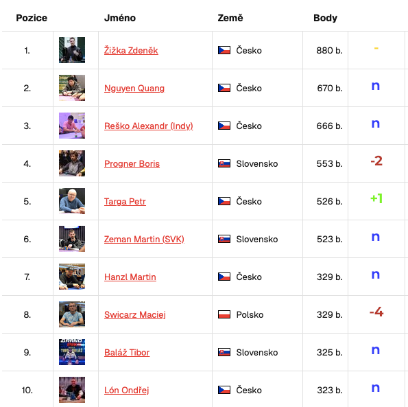 Soupeři ale nespí. Do TOP10 nově nakoukli Quang Nguyen a Alexandr Reško a oba jsou Žižkovi na dohled.