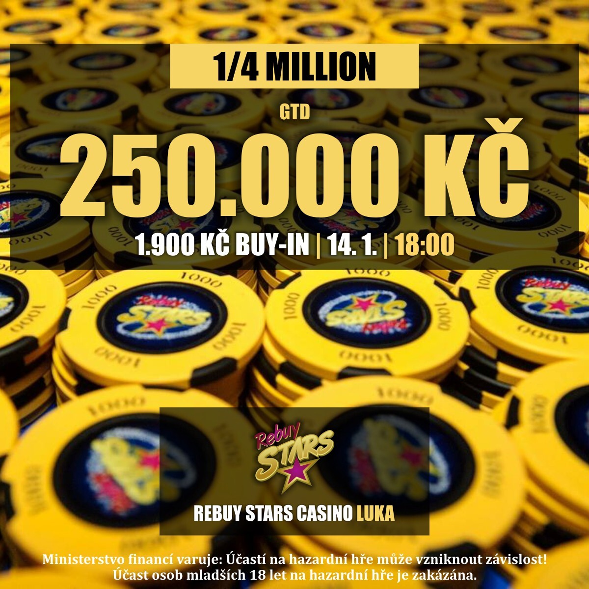 V pátek 14. ledna je na programu v Rebuy Stars Casinu Luka další z velmi oblíbených speciálů – 1/4 Million. Jak napovídá název turnaje, v jednodenním speciálu si zahrajete o rovných 250.000 korun.