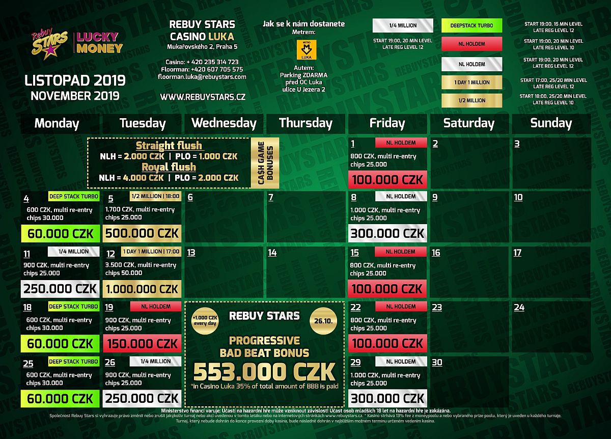 Listopadová nabídka na Lukách je pěkně štědrá. Téměř každý týden si zahrajete alespoň jeden speciál o minimálně 250.000 Kč. Podívejte se na kompletní rozpis turnajů a rezervujte si své pokerové večery v kalendáři.