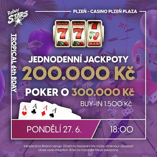 Plzeňské Casino Rebuy Stars Plaza slaví své šesté narozeniny. Už dnes večer na vás v Plzni čeká pokerový turnaj s garancí 300.000 Kč, k tomu další doprovodné soutěže a jackpoty za 200K.