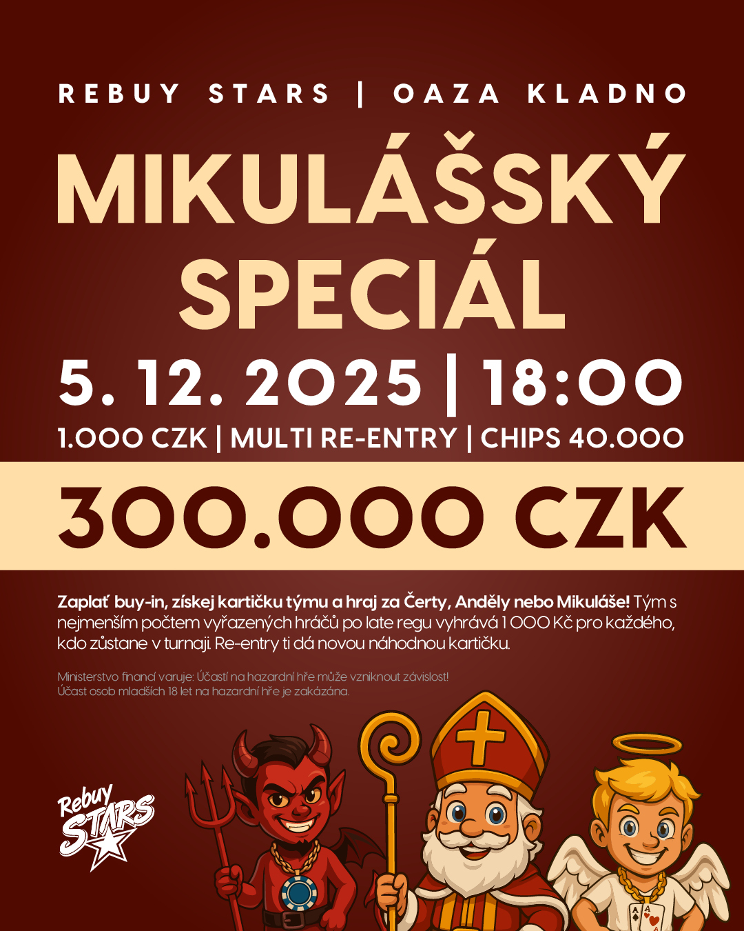 Hned v pátek 5. prosince proběhne další zajímavý tematický večírek, Mikulášský Speciál s buy-inem 1.000 Kč a garancí 300.000 Kč. Specialitou bude souboj týmů, čerti, andělé a Mikuláši. Každý hráč při vstupu do turnaje dostane náhodnou kartičku do jednoho ze tří zmíněných týmů a po konci registrace získá každý člen týmu s nejméně vyřazenými hráči bonus 1.000 Kč. O zábavu bude rozhodně postaráno, začátek bude v 18:00.