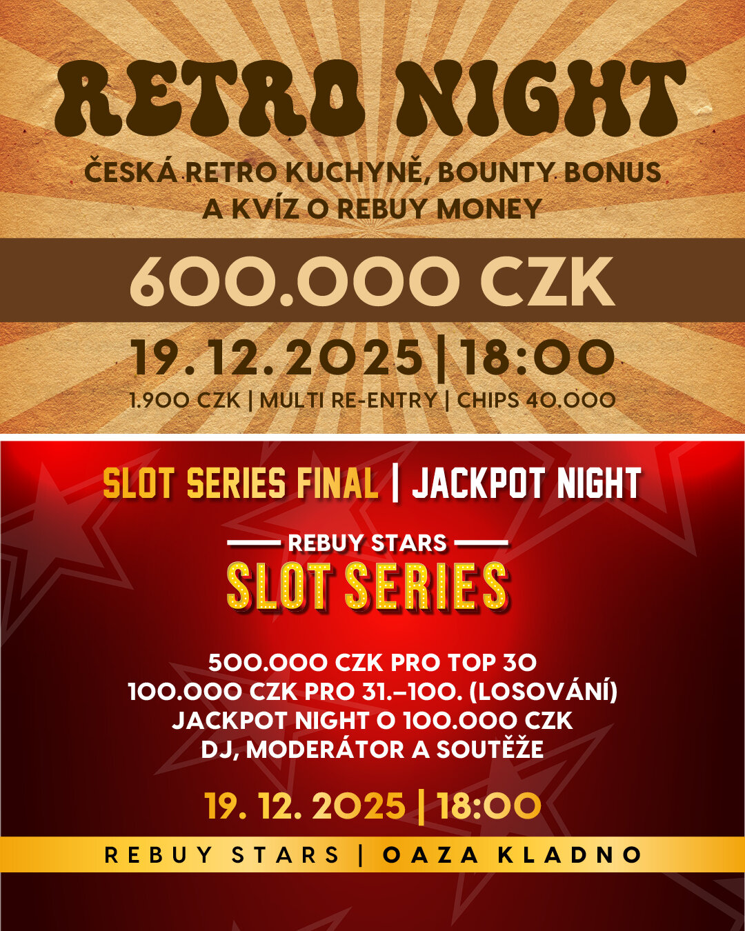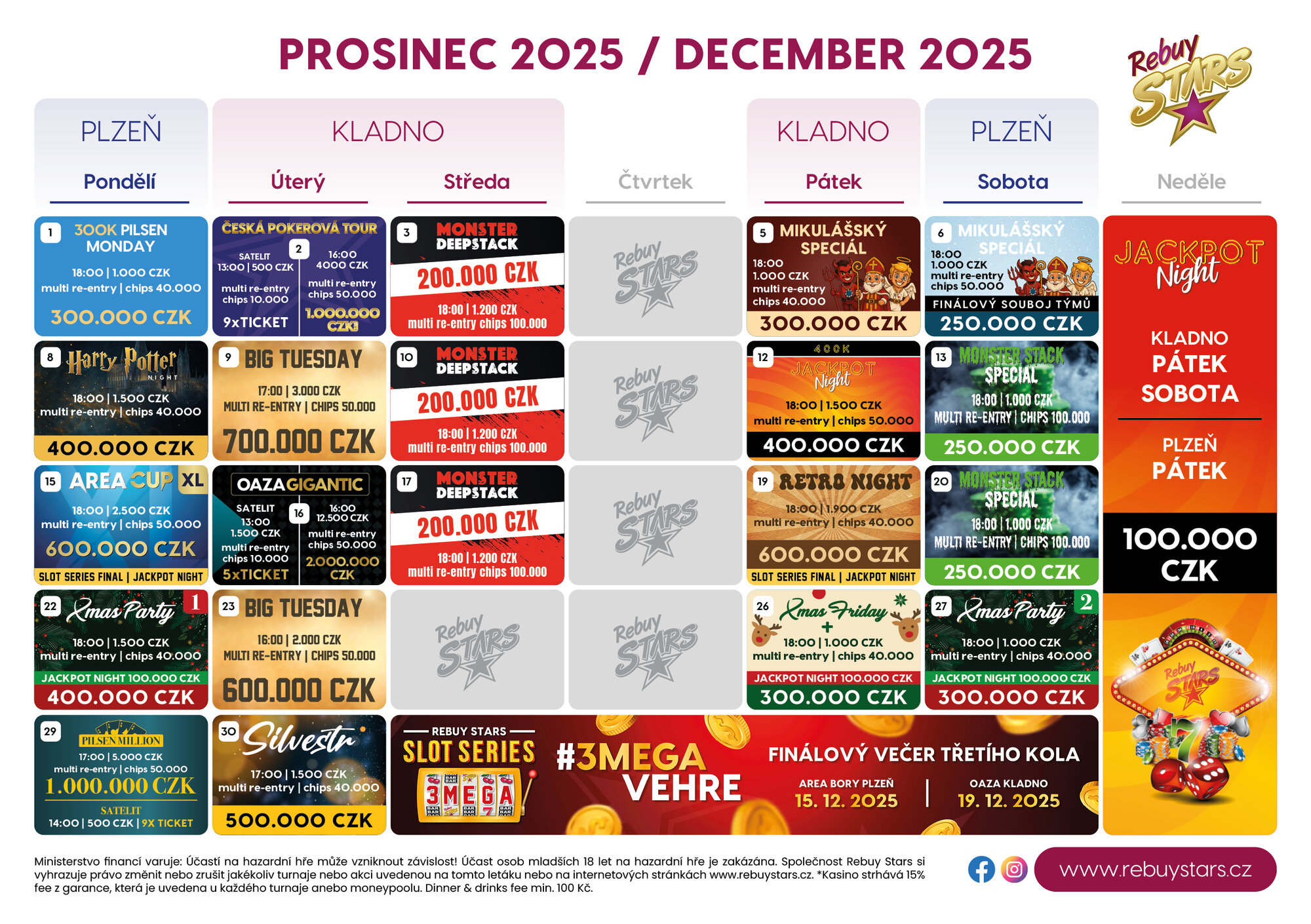 Poslední měsíc roku proběhne v kladenském Rebuy Stars Casinu Oaza ve velkém stylu. Na programu budou opravdové turnajové lahůdky, jako například ČPT, Gigantic, Retro Night nebo Silvestr.