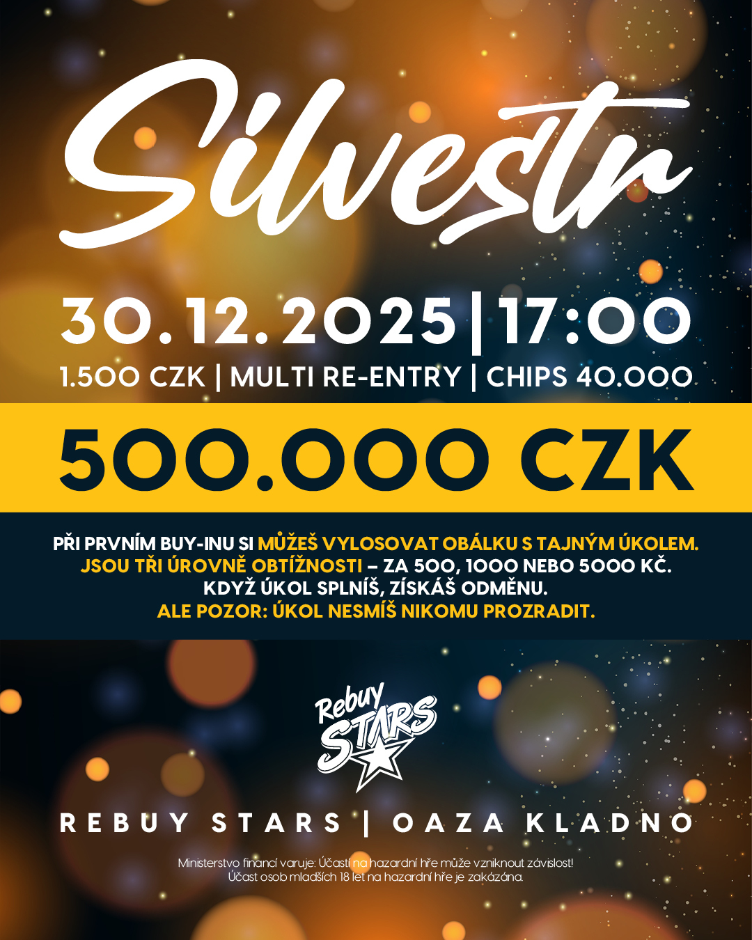 Prosinec a celý rok 2025 uzavře poslední pokerový večírek, Silvestr, který se však uskuteční o den dříve, tedy v úterý 30. prosince. Turnaj nabídne garantovaný prizepool 500.000 Kč za přijatelných 1.500 Kč.