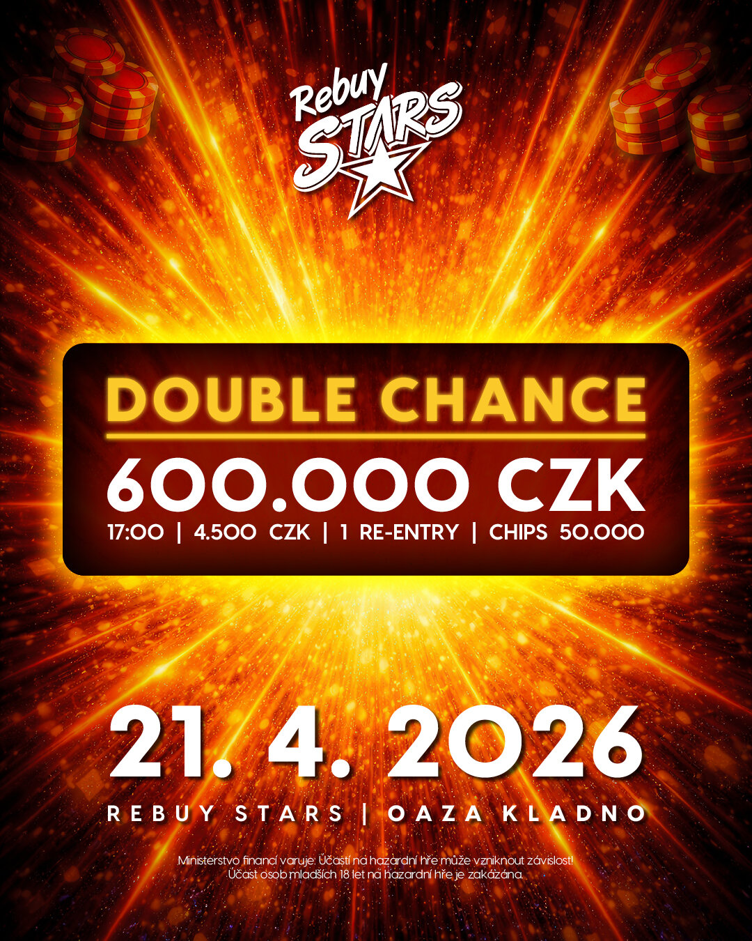 V úterý se v kladenském Rebuy Stars Casinu Oaza uskuteční pokerový event Double Chance, ve kterém se budou rozdělovat podíly z garantovaného prizepoolu 600.000 Kč a do hry vás dostane buy-in 4.500 Kč.