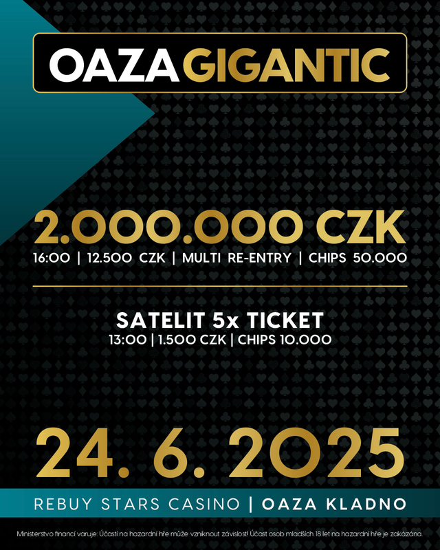 Součástí garantovaných prizepoolů turnajů z rodiny Rebuy Stars jsou i v květnu tikety do červnového Oaza Giganticu 2M GTD. Dvoumilionový Oaza Gigantic je naplánovaný na úterý 24. června.