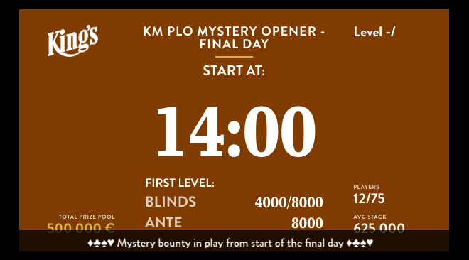V rozvadovském King's Resortu pokračoval ve středu festival King's Million PLO. Zahajovacím eventem je King's Million PLO Mystery Opener, který garantuje prizepool ve výši €500.000 a buy-in činí €4.000 + €1.000(bounty).