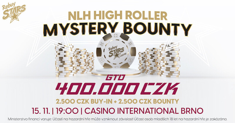 V úterý 15. listopadu se v Rebuy Stars Casinu International odehraje turnaj NLH High Roller Mystery Bounty s garancí 400.000 Kč. Hodnota samotné KO odměny za vyřazení přitom zůstane záhadou. Až do konce registrace turnaj probíhá jako každý normální event bez KO odměny. Až ve druhé fázi turnaje dojde na Bounty. Jeho hodnotu za vyřazeného hráče si vytočíte na kole štěstí.