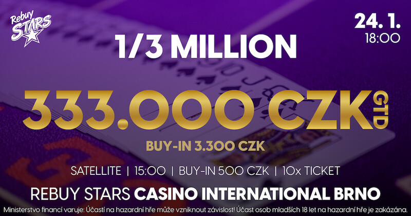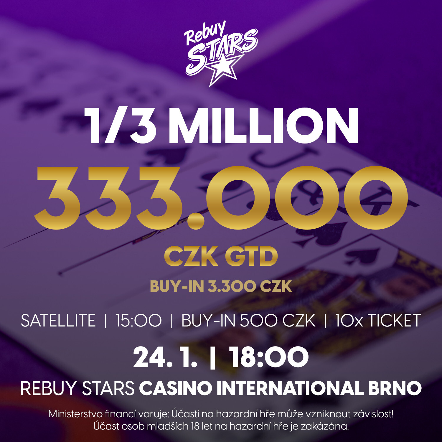 V úterý 24. ledna je na programu v Rebuy Stars Casinu International Brno pokerový turnaj – 1/3 Million. V jednodenním speciálu si zahraješ o rovných 333.000 korun. Do hry tě dostane buy-in 3.300 Kč. Start je nastaven na 18:00!