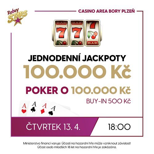 Ve čtvrtek večer se v Rebuy Stars Casinu Area Bory Plzeň můžete těšit na Jackpot Night, během které se rozdá na bonusech 100.000 Kč. Zábavu bude doprovázet poker event o dalších 100.000 Kč a to při pouhém buy-inu 500 Kč.