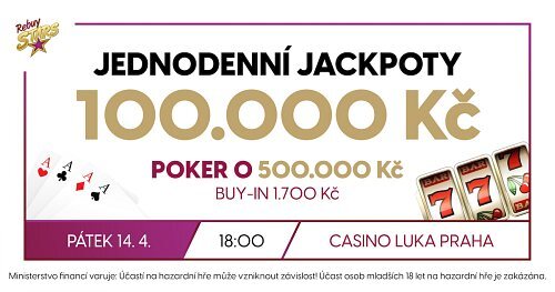 V pátek 14. dubna budeme v pražském Rebuy Stars Casinu Luka hrát celkem o 600.000 korun. Pokerový turnaj nabídne garanci 500.000 korun a další lákavé bonusy v hodnotě 100.000 Kč rozdělíme díky speciální Slot Jackpot Night.