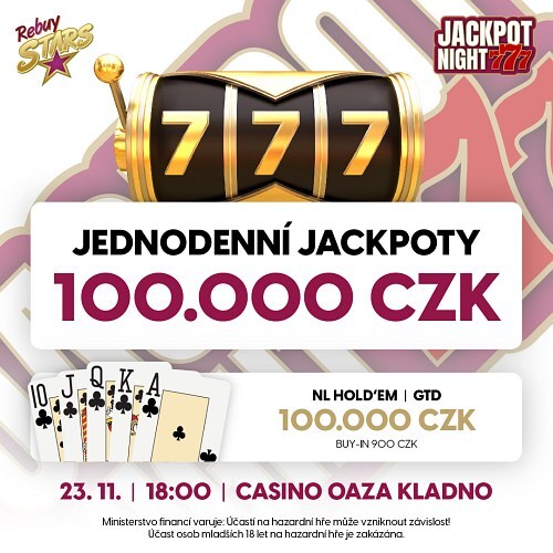 Na čtvrtek 23. listopadu je na Kladně připravena oblíbená Jackpot Night. Přijď se pobavit na Jackpot Night do Rebuy Stars Casina OAZA Kladno, trefit jackpot a nahrát minuty navíc ve hře - Rentiér. Pro pokerové nadšence nechybí pokerový speciál o 100.000 Kč.