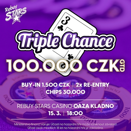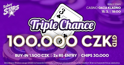 Triple Chance nabídne souboj o garantovaných 100.000 korun. Do turnaje se dostanete za buy-in 1.500 korun, za který získáte 30.000 žetonů do hry. Pokerový event začíná v 18:00 hodin a pozdní registrace je otevřená až do konce 10 levelu (10x 20 minut). V tomto turnaji máte možnost využít dvakrát re-entry, více životů není povoleno.