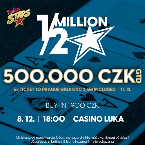 V pátek 8. prosince bude v Rebuy Stars Casinu Luka pěkně živo. Celkové odměny ve večerním turnaji 1/2 Million se vyšplhají na částku 500.000 korun včetně 5x ticketu do prestižního turnaje Prague Gigantic 2,5M!