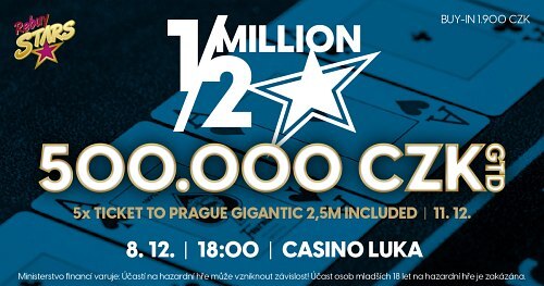 Další půl milion korun je tady! V pátek 8. prosince je na programu v pražském Rebuy Stars Casinu Luka oblíbený pokerový speciál 1/2 Million. Jak napovídá název turnaje, v jednodenním speciálu si zahraješ o 500.000 korun včetně 5x vstupenky do Prague Gigantic 2,5M | 11. prosince.