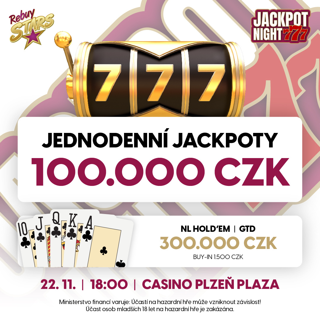 Ve středu vás zve plzeňské Rebuy Stars Casino Plaza na pokerový event, který za vstupné 1.500 Kč nabídne do hry ohromných 300.000 Kč. Večer bude doprovázet Jackpot Night o dalších 100.000 Kč.