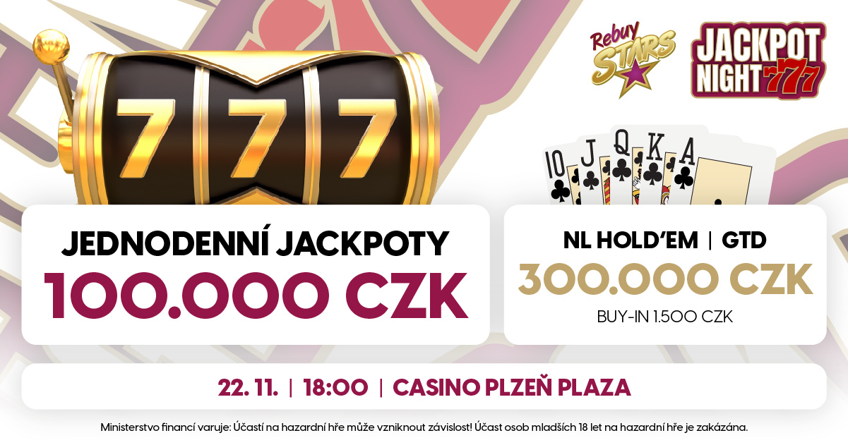 Ve středu 22. listopadu budeme v plzeňském Rebuy Stars Casinu Plaza hrát celkem o 400.000 korun. Pokerový turnaj nabídne garanci 300.000 korun a další lákavé bonusy v hodnotě 100.000 Kč rozdělíme díky speciální Slot Jackpot Night.