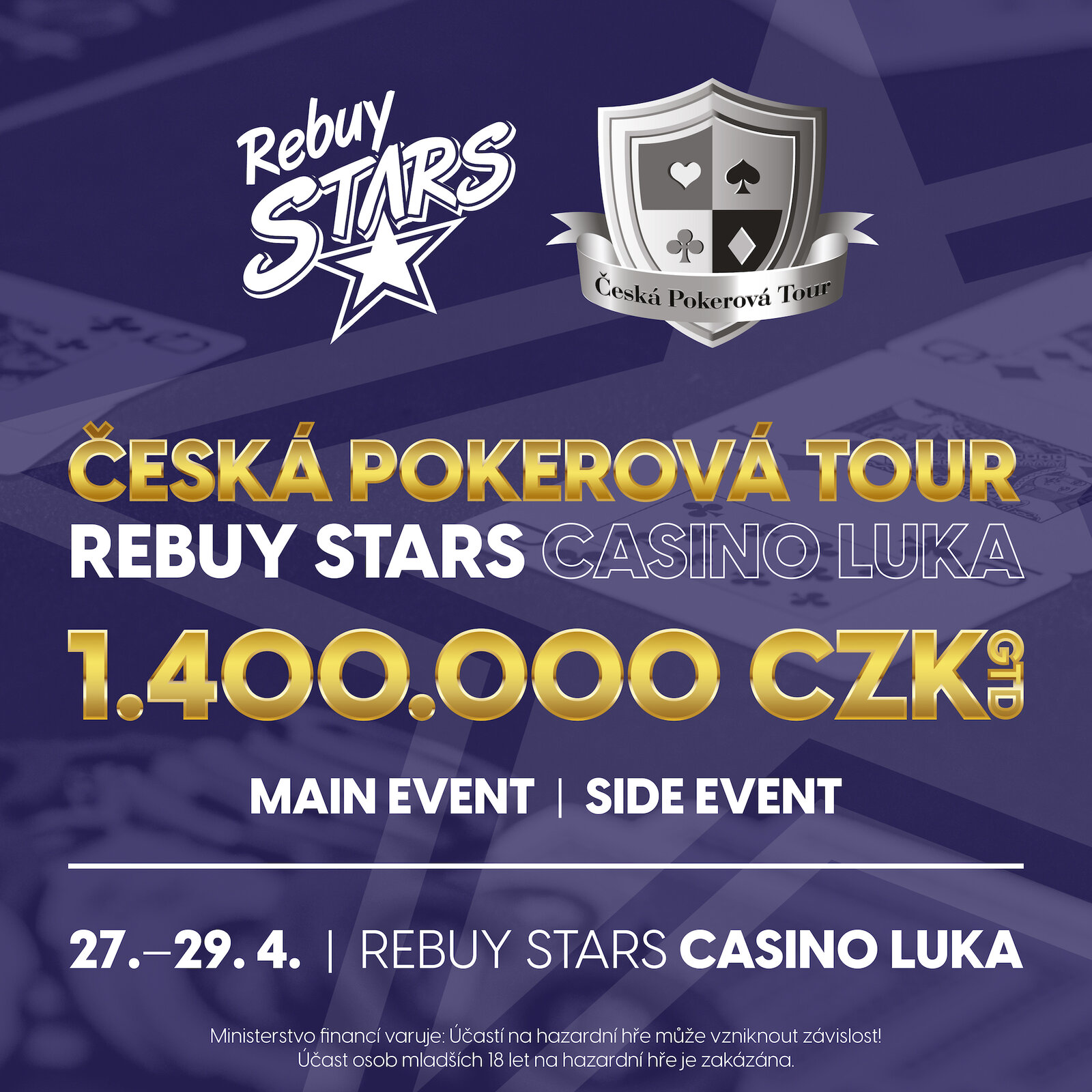 Konec dubna bude v Rebuy Stars Casinu na Lukách ve znamení prestižní České Pokerové Tour. Oblíbený turnaj tentokrát nabídne hned dvě turnajová klání: Dvoudenní ČPT Main Event s garancí 1.000.000 Kč ve dnech 28. a 29. dubna a ČPT Side Event o skvělých 400.000 Kč v sobotu 29. dubna. Do Main Eventu se můžete kvalifikovat i díky satelitům, které celkem slibují nejméně 35 ticketů. Nenechte si to ujít!