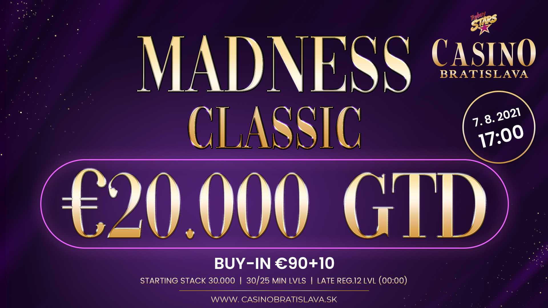Casino Bratislava Rebuy Stars si na léto připravilo pro hráče atraktivní sérii turnajů, ze série Madness Classic. Každou sobotu garance €20.000, ke které připočítáme otevírací turnaj a závěrečný GRAND FINAL, celkem se hraje o šílených €240.000!