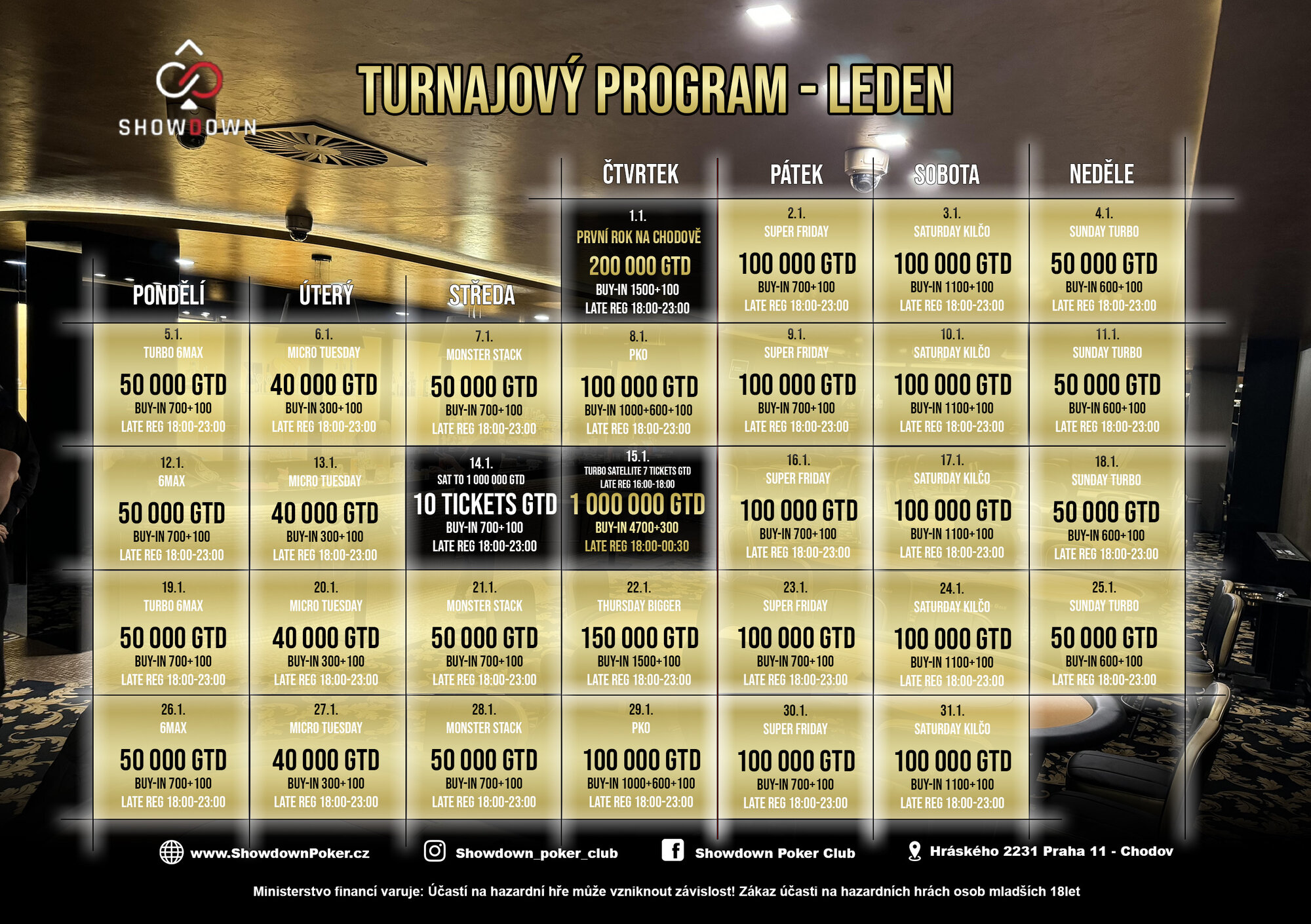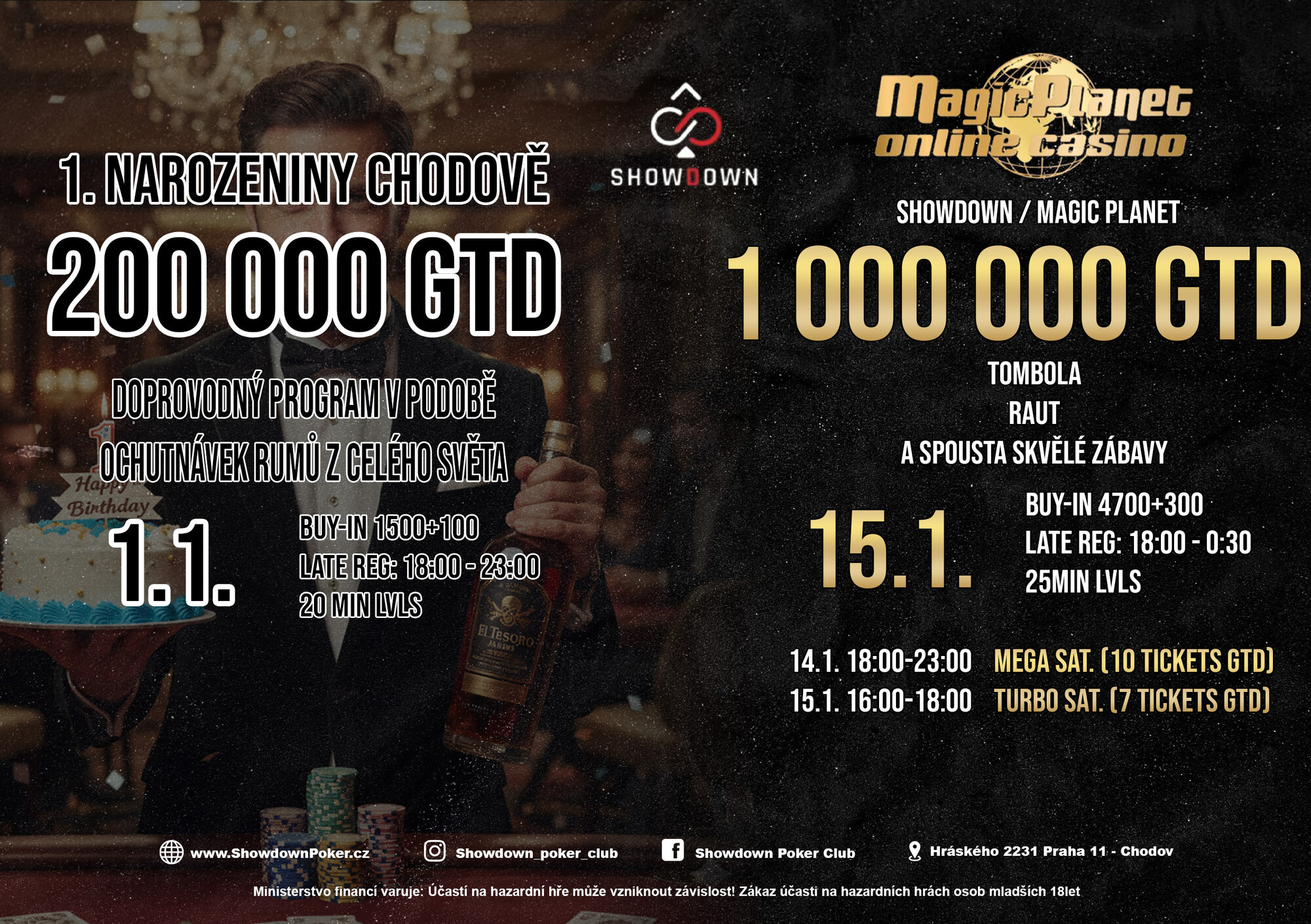 Leden v Showdownu - to budou oslavy prvních narozenin v nových prostorech na Chodově, ale také jednodenní turnaj o milion, či mnoho dalších eventů za pár stokorun o zajímavé peníze.