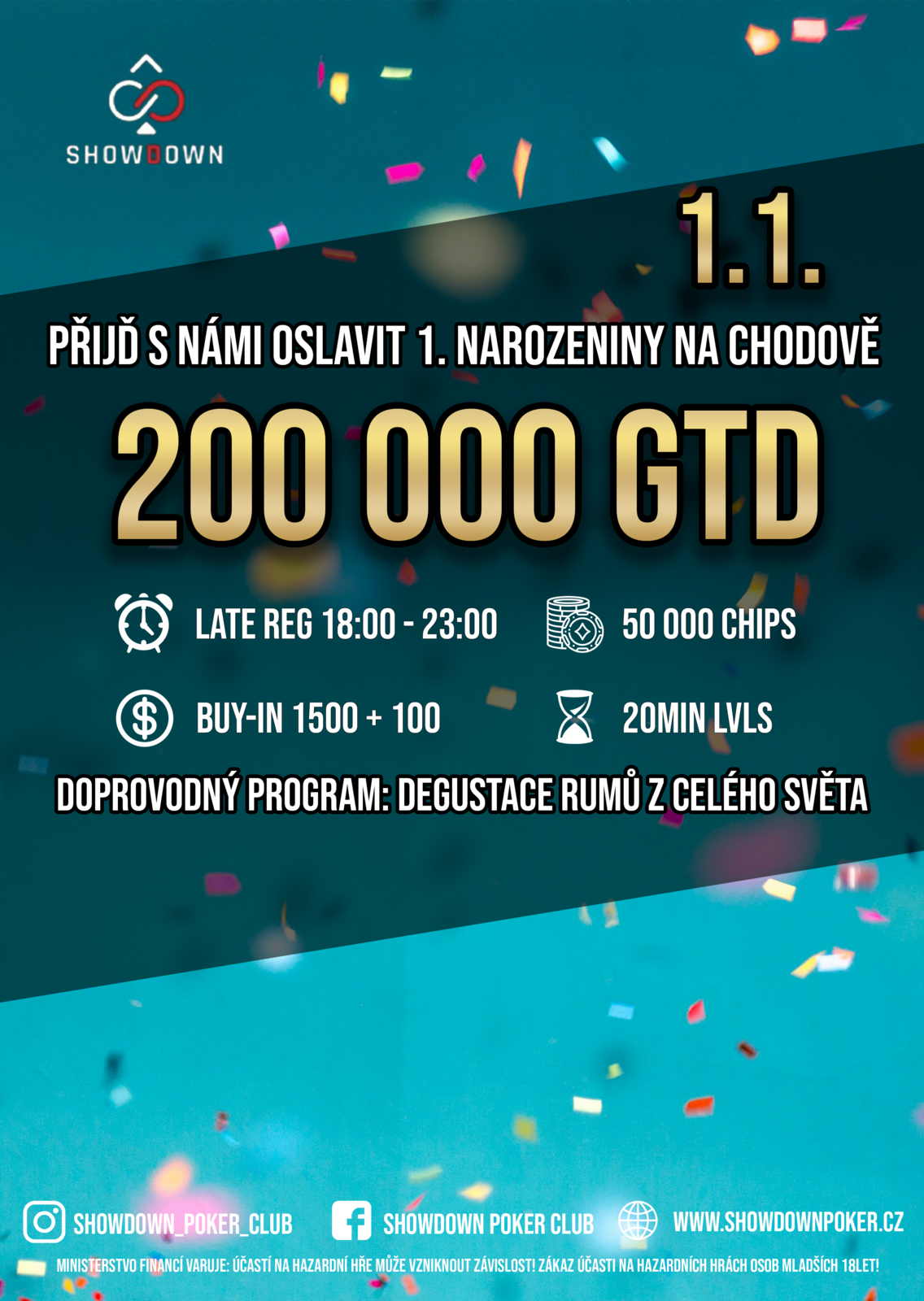 Je tomu již rok, co Showdown Poker Club našel domov v nových prostorech na Chodově a to by se patřilo řádně oslavit. Na adrese Hráského 25 pro vás tedy bude hned na Nový rok, 1 ledna, připraven turnaj s garancí 200.000 Kč a doprovodným programem v podobě ochutnávek rumů.