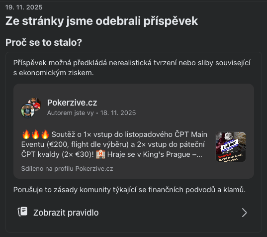 Člověk míní, ale pánbůh a facebook mění. Připravená soutěž na facebooku Pokerzive.cz, k nadcházející České Pokerové Tour v Hiltonu, byla provozovatelem této sociálně sítě vyhodnocena jako škodlivá, přestože několik podobných či úplně kompletně totožných soutěží na našem profilu v posledních měsících bez problémů proběhlo, a listopadový soutěžní příspěvek včetně všech soutěžních komentářů byl společností Meta, pravděpodobně některým z robotů ať už z důvodu nahlášení či jiného náhodného prozření, odstraněn.