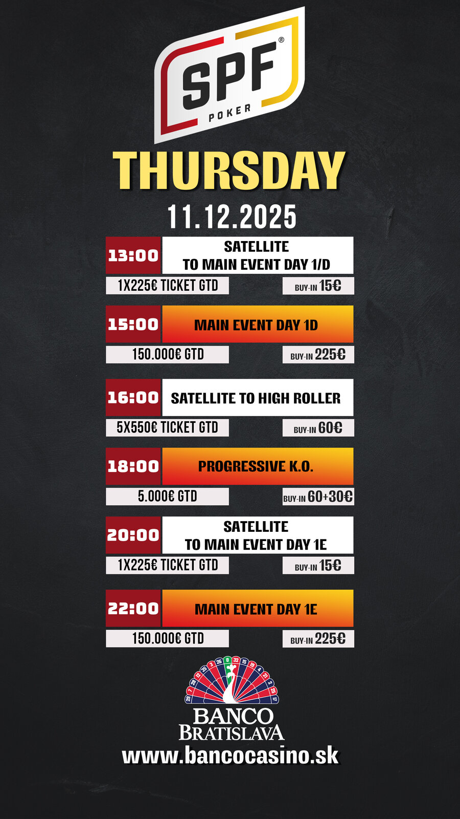 Prvním šampionem SPF se stal David Gilbert Mata, který v konkurenci 56 hráčů ovládl NLH Freezeout, v nočním TUrbo eventu si pak počínal nejlépe domácí Samo Marušinec.