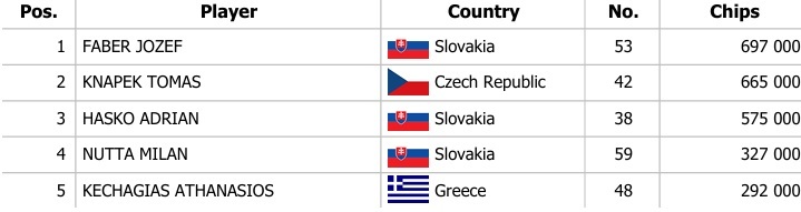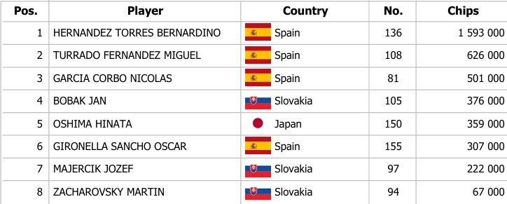 Středeční flight 1C Main Eventu nakonec zaznamenal solidních 81 registrací, z nichž si postup zajistilo dle stanového desetiprocentního klíče osm nejlepších. Nejvíce koleček zabalil Španěl Hernandez, ve světle ram se ale ocitl také Martin Zacharovský, který postoupil už podruhé, na super shortu přečkal bublinu, a získal tak postupový bonus ve výši €1.500! Podaří se mu postoupit i potřetí a zabrat dokonce €4.000?
