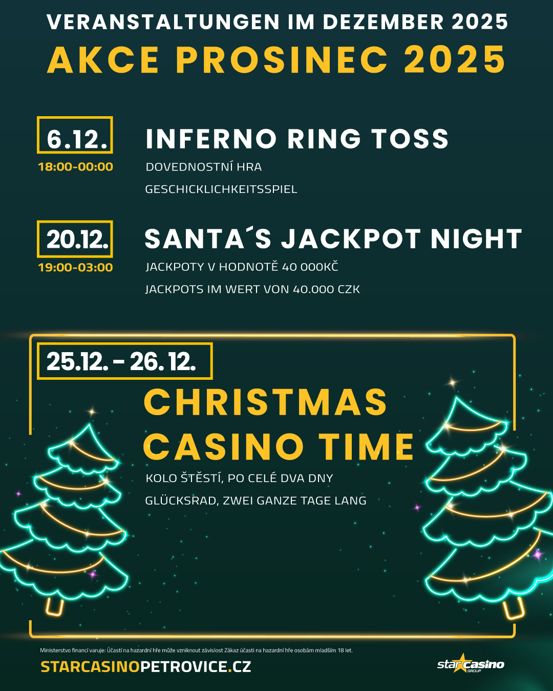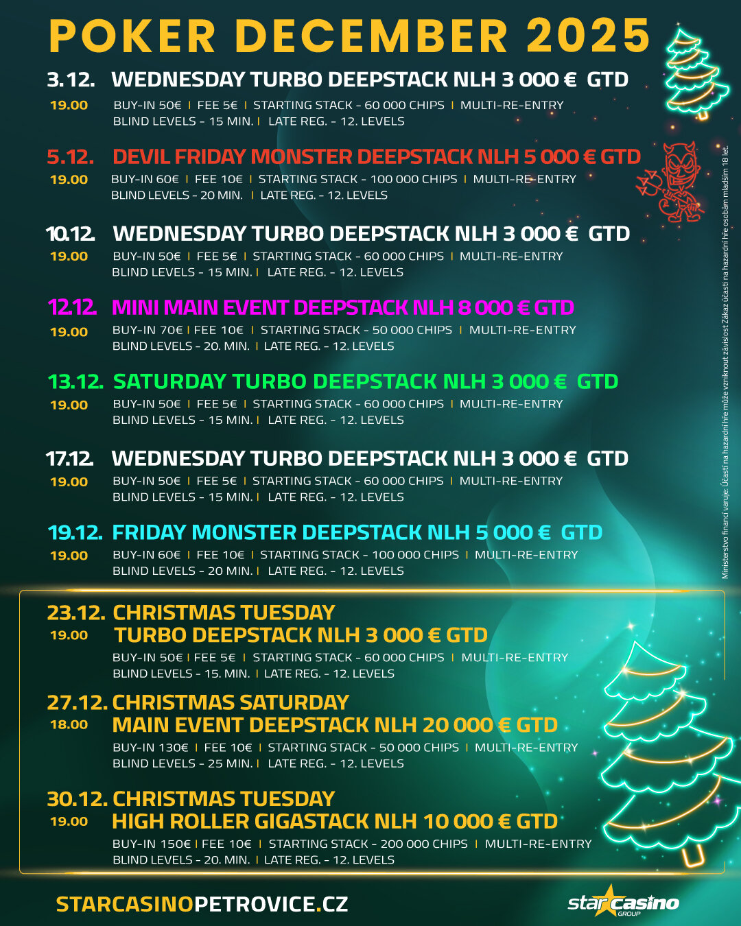Dvakrát až třikrát do týdne je připravena v prosinci turnajová akce ve Star Casinu Petrovice. V rámci turnajového programu je připraveno deset eventů s celkovou garancí €63.000!