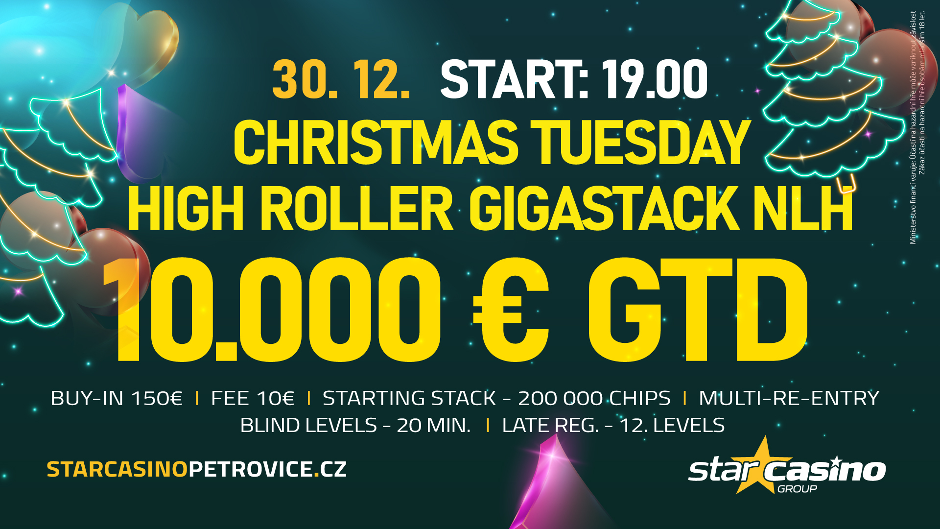 Poslední úterý letošního roku pak nabídne High Roller GigaStack. Buy-in €150+10, starting stack 200.000 v žetonech, blind levely po 20 minutách a garance €10.000!