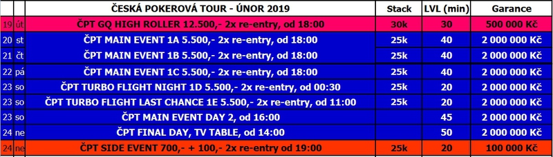 V úterý 19.2. a ve středu 20.2. se takto losuje vždy jeden lístek na ČPT, ve čtvrtek 21.2. dokonce 2 lístky, které jsou mířeny na flight ČPT Last Chance 1E (v sobotu 23.2. od 11 dop. v Golden Queen)!!! V sobotu 23.2. se losovací uragán rozjede na plné obrátky! Bude se tahat z randomizéru 10 pozic majitelů lístků v hodnotě 800 Kč na nedělní Side Event ČPT s garancí 100.000 Kč!!! Tady už bude průběh losování takový, že se vylosuje jeden lístek při začátku turnaje v 19:00, poté 1 lístek v 20:00, další v 21:00, stejně tak v 22:00 a v 23:00. O půlnoci se pak z přítomných hráčů vylosuje zbylých 5 lístků!