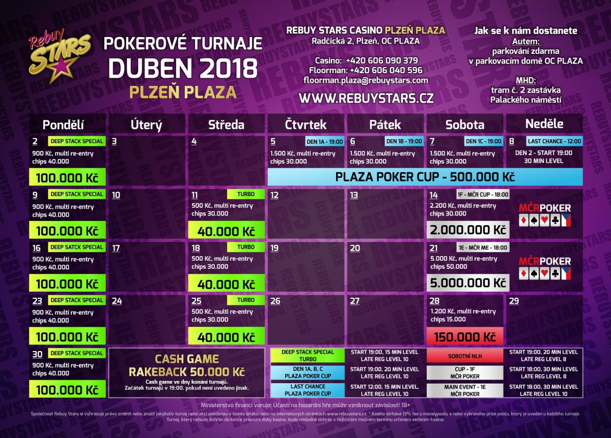 Celkem 500.000 korun je připraveno pro pokerové hráče během Plaza Poker Cupu od 5. do 8. dubna. Každé pondělí navíc můžete hrát o prize pool 100.000 korun a ochuzeni nebudete ani o oblíbené středeční turbo. Rebuy Stars Casino Plaza nabídne v dubnu v Plzni i startovní flighty do Main Eventu MČR o 5.000.000 korun a do MČR Cupu o 2.000.000 korun, jejichž druhé hrací dny se hrají v pražském Rebuy Stars Casinu Savarin.