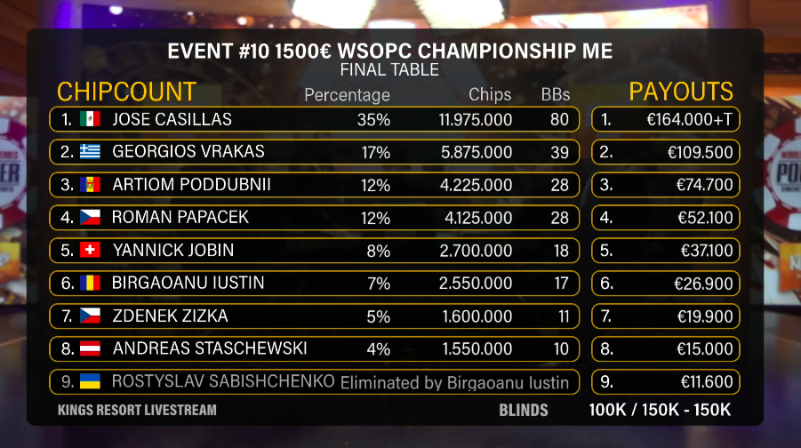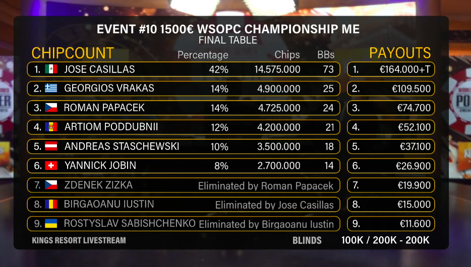 Jenže houpačka pokračuje a nakonec se směje Vrakas. Tentokrát mu stačilo 32%, allin na turnu, na riveru dvojka do tripsu, Casillas padá na posledních sedm bigů a do pár minut je hotovo. Lednový Main Event WSOPC si podmanil Georgios Vrakas.